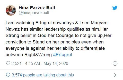 مسلم لیگ ن کی رہنما حنا پرویز بٹ کا کہنا ہے کہ سابق وزیر اعظم نواز شریف کی صاحبزادی مریم نواز سلطنت عثمانیہ کے بانی عثمان اول کے والد ارطغرل جیسی قائدانہ صلاحیتوں کی مالک ہیں۔سماجی رابطے کی ویب سائٹ ٹوئٹر پر حنا پرویز بٹ نے بتایا کہ آج کل وہ وزیر اعظم کی ہدایت پر نشر کی جانے والی ترکش سیریز ’ارطغرل غازی‘ دیکھ رہی ہیں۔انہوں نے اپنے ٹوئٹ میں لکھا کہ ارطغرل کی خوبیوں یعنی اپنے خدا پر مضبوط ایمان، حوصلہ، بہادری، بدترین حالات میں بھی ہمت نہ ہارنا، اچھے اور برے لوگوں کی پہچان، سب لوگوں کی مخالفت کے باوجود اپنے مقصد پر کھڑے رہنا جیسی خوبیوں کی مریم نواز بھی مالک ہیں۔