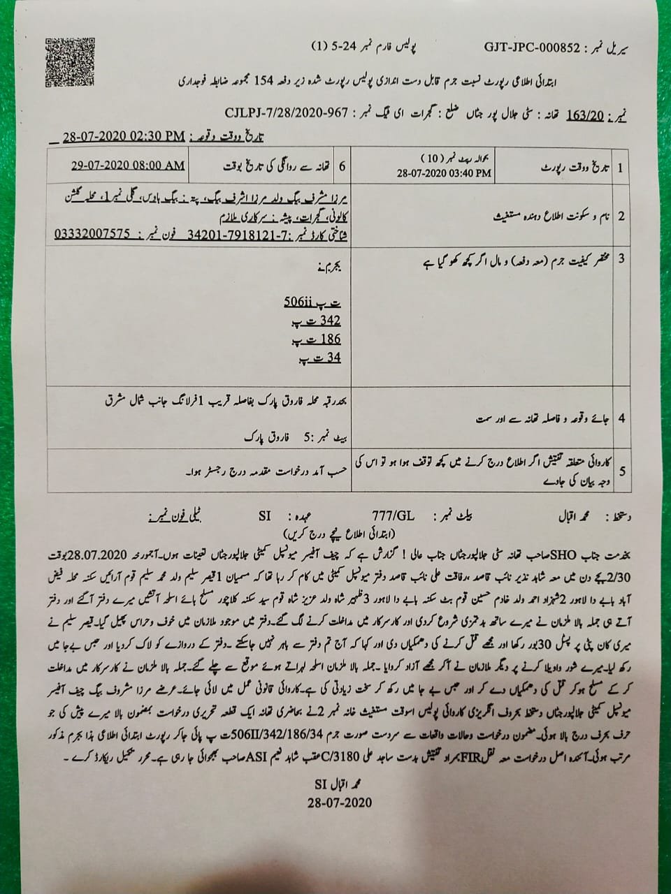 گجرات ( آکاش نیازی ) روشن پاکستان منصوبہ بلدیہ جلالپورجٹاں کے چیف آفیسر کو مہنگا پڑ گیا مسلح افراد کا بلدیہ آفس پر دھاوا چیف آفیسر مرزا مشرف بیگ پر تشدد قتل کی دھمکیاں پولیس نے فوری کاروائی کرتے ھوئے حملہ آور گرفتار کر لئے مقدمہ درج چیف آفیسر مرزا مشرف بیگ کی مدعیت میں تھانہ سٹی جلالپورجٹاں میں درج کروائی گئی ایف آئی آر نمبر 163/20 کے مطابق بلدیہ جلالپورجٹاں آفس میں صبح آٹھ بجے مسلح افراد قیصر سلیم مہر سکنہ محلہ فیض آباد بابے دا لاھور۔ شہزاد بٹ ولد خادم حسین بٹ سکنہ بابے دا لاھور۔ ظہیر شاہ ولد عزیز شاہ سکنہ کلاچور۔ مسلح آتشیں اسلحہ گھس آئے اور چیف آفیسر کے کمرہ میں گھس گئے اور چیف آفیسر مرزا مشرف بیگ سے بدتمیزی شروع کردی اور کار سرکار میں مداخلت کرنے لگے دفتر میں موجود ملازمین میں خوف و ھراس پھیل گیا قیصر سلیم نے میری کنپٹی پر 30 بور پسٹل رکھا اور مجھے قتل کی دھمکیاں دیں اور کیا تم آج دفتر سے باھر نہیں جا سکتے دفتر کے دروازے کو لاک کر دیا اور حبس بے جا میں رکھ لیا میرے شور واویلہ کرنے پر دیگر ملازمین نے مجھے آ کر آزاد کروایا بلدیہ آفس پر مسلح افراد کے حملہ کی اطلاع ملتے ھی ایس ایچ او تھانہ سٹی جلاپورجٹاں عدنان تارڑ معہ نفری موقع پر پہنچ گئے اور علاقہ کی ناکہ بندی کر کے ملزمان قیصر سلیم۔ شہزاد بٹ۔ اور ظہیر شاہ کو گرفتار کر لیا رابطہ کرنے پر ایس ایچ او عدنان تارڑ نے بتایا حملہ میں استعمال ھونے والا ناجائز اسلحہ 30 بور پسٹل بھی برآمد کر لیا گیا ھے کسی کو علاقہ میں غنڈہ گردی بدمعاشی نہیں کرنے دینگے گرفتار ملزمان کا سابقہ ریکارڈ بھی حاصل کر لیا گیا ھے بلدیہ آفس جلالپورجٹاں میں سیکورٹی کے لئے پولیس اھلکار بھی تعینات کر دئے گئے بلدیہ آفس جلالپورجٹاں پر مسلح افراد کے حملہ کی ڈپٹی کمشنر گجرات ڈاکٹر خرم شہزاد اور اے سی گجرات محمد جمیل نے بھی رپورٹ طلب کر لی ھے